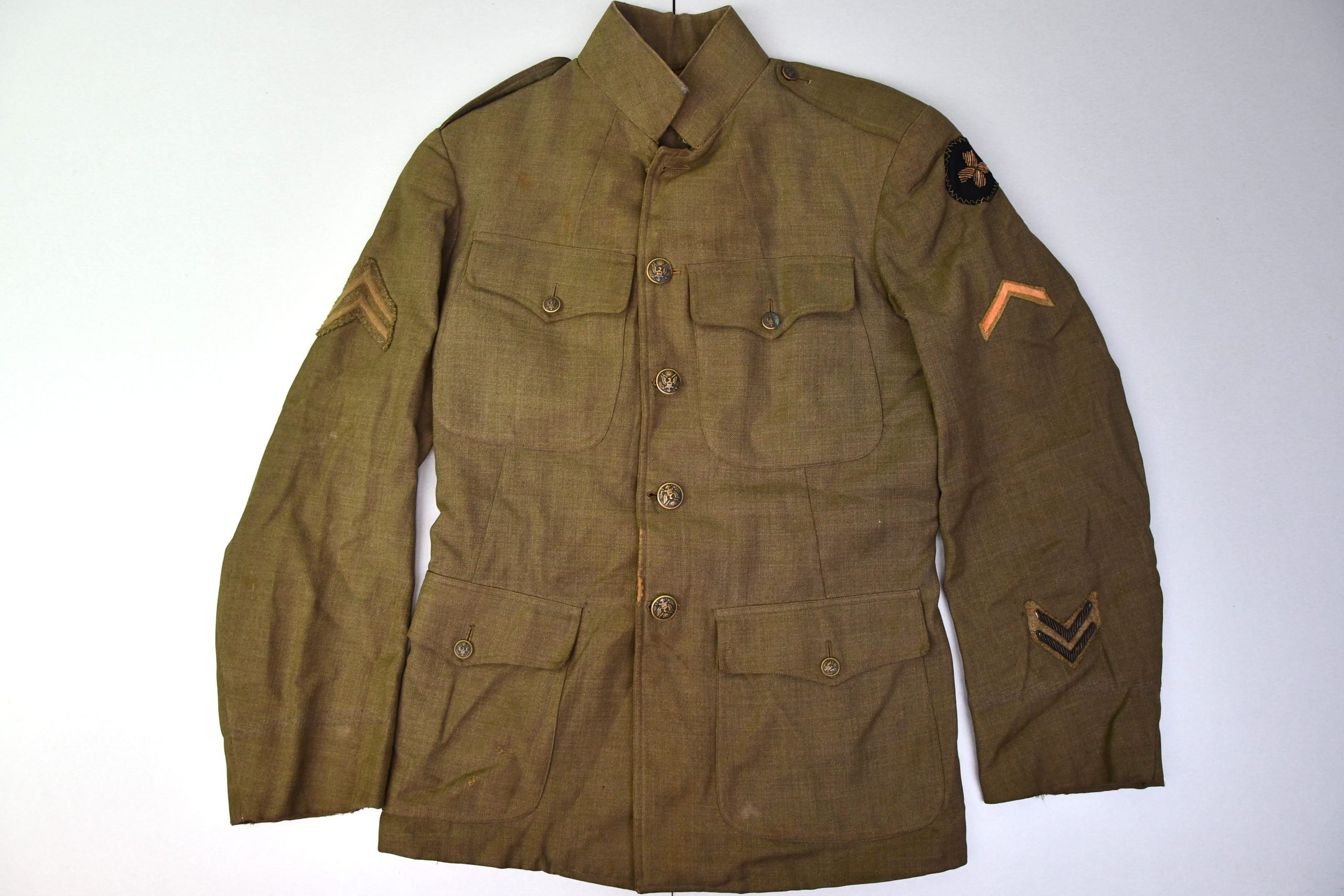 A WW1 American four-pocket khaki tunic, attributed to the37th Infantry Division.The tunic is fitted with American eagle tunic buttons and displays Machine Gun Infantry and 'US' collar discs, indicating branch of service.The sleeve bears a felt 37th Division patch, with a felt chevron and bullion inverted chevron to the lower arm, denoting enlisted rank and overseas service.The tunic remains in generally good condition, with well-preserved insignia throughout.A solid and attractive example of a WW1 U.S. Army divisional tunic, suitable for display or collection.
