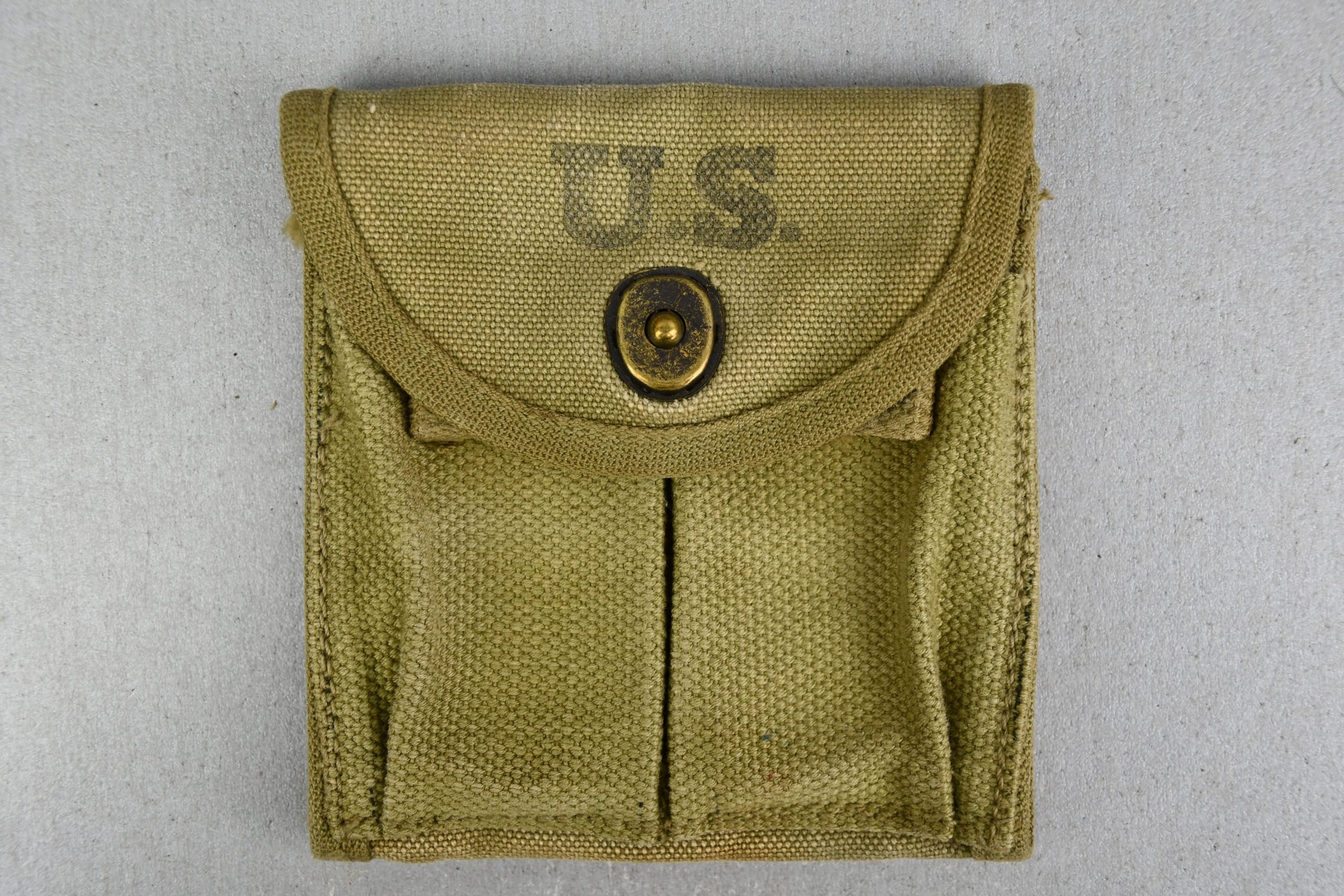 Officially called Pocket, Magazine, Double, Web, For Carbine, Caliber .30, M-1, this ammo pouch was made by Rubon in 1942 and is clearly so marked.These pouches were issued to GIs armed with the M1 or Paratrooper M1A1 Carbine and were carried on the belt or sometimes slid over the stock of the carbine. They held two 15-round magazines.A very nice pouch which will display well!