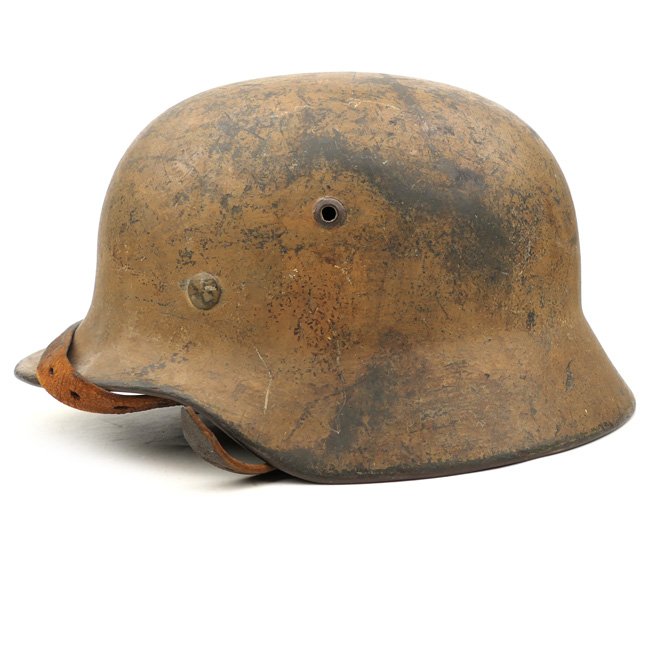 Wehrmacht (Heer) Single Decal M35 'Afrika' Camouflage Combat Helmet (Stahlhelm M35). The stamped sheet steel construction M35 helmet shows a nice Afrika tan coloured camouflage paint, applied by brush, the original fieldgrey colour is still visible beneath the liner. A Heeres decal is visible beneath the camouflage overpaint. The paint shows normal wear and scratches caused by usage, see photos. All three liner retaining rivets are intact. The helmet is complete with its original liner, complete with all eight fingers intact. The shell is marked with maker and size 'Q64' (hard to read through the thick paint).Q' is indicating production by the 'F.W. Quist, G.m.b.H.' in Esslingen.The reverse interior neck guard apron has a stamped lot-number. The helmet is complete with its original slightly damaged chinstrap as found together. The helmet is in overall very good untouched condition. Great original tan coloured 'Afrikakorps' helmet!
