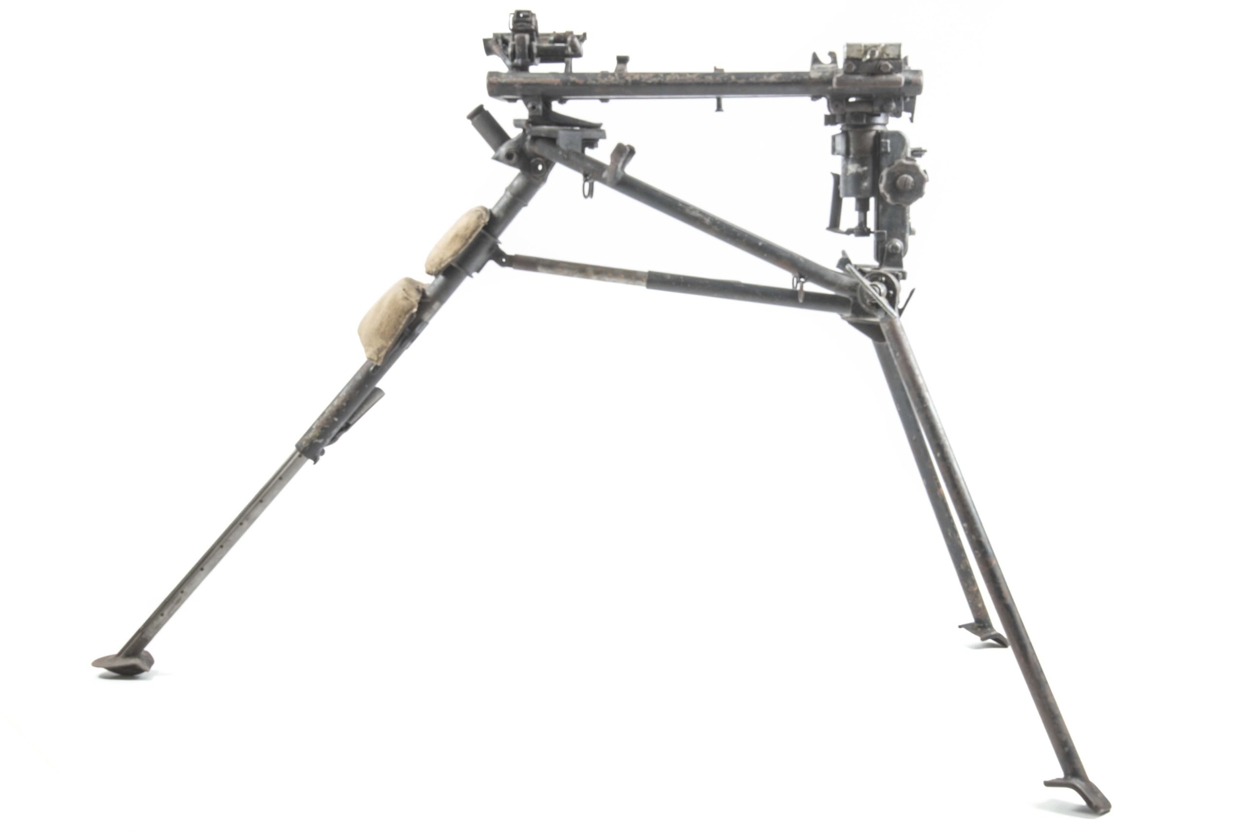 Rare pre war MG34 Lafette dated 1938 in original paint which would be very hard to upgrade. The Lafette is a pre war 1938 dated example with full original details. From the factory this Lafette would have been finished in Buntfarbenanstrich which can be seen underneath the field grey paint. The Lafette has its Aluminium WaA 383 optic mounting block. The Lafette is a hard to find pre war example in untouched condition. There are several layers of wartime applied paint with the field grey finish being on top. The Lafette seems to be complete and typical for this variant without the deflector tray or spare bolt box. The oil brush in the handle is missing. It is not to be confused with a restored example; the paint finish on the Lafette is original. The Lafette would be a great piece in a equipment display and isexceptionally hardto find in this working and untouched condition!I can offer NO shipping for this item due to its size and weight. Pickup on a Netherlands, Belgian or German militaria fair can be organised. If you wish to acquire it please reserve it trough the webshop.