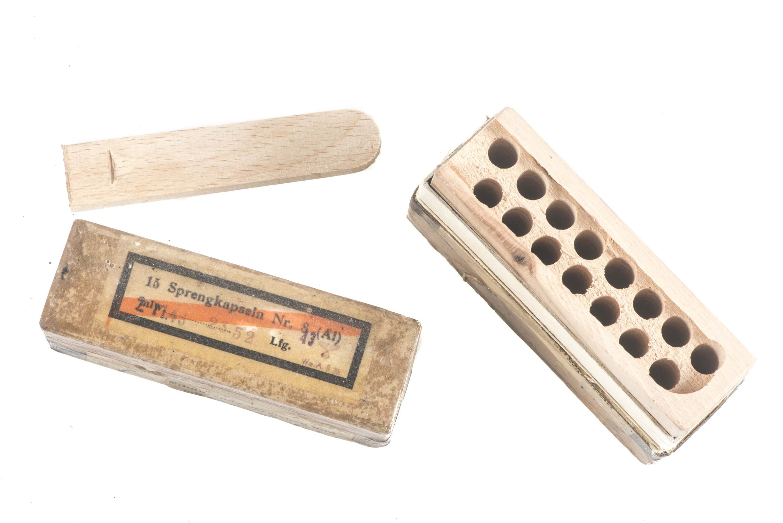 Rare wooden box complete with its cardboard packaging for the transport of 15 Sprengkapseln Nr. 8 (AI). Very hard to find complete with the cardboard packaging as well! The box is of course empty and without any content but in unissud condition!