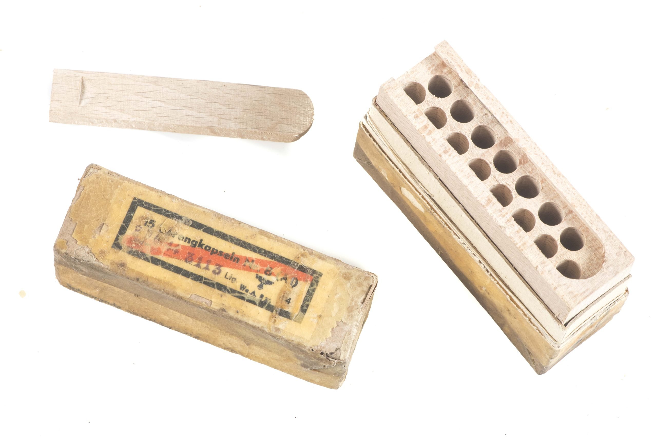 Rare wooden box complete with its cardboard packaging for the transport of 15 Sprengkapseln Nr. 8 (AI). Very hard to find complete with the cardboard packaging as well! The box is of course empty and without any content but in unissud condition!