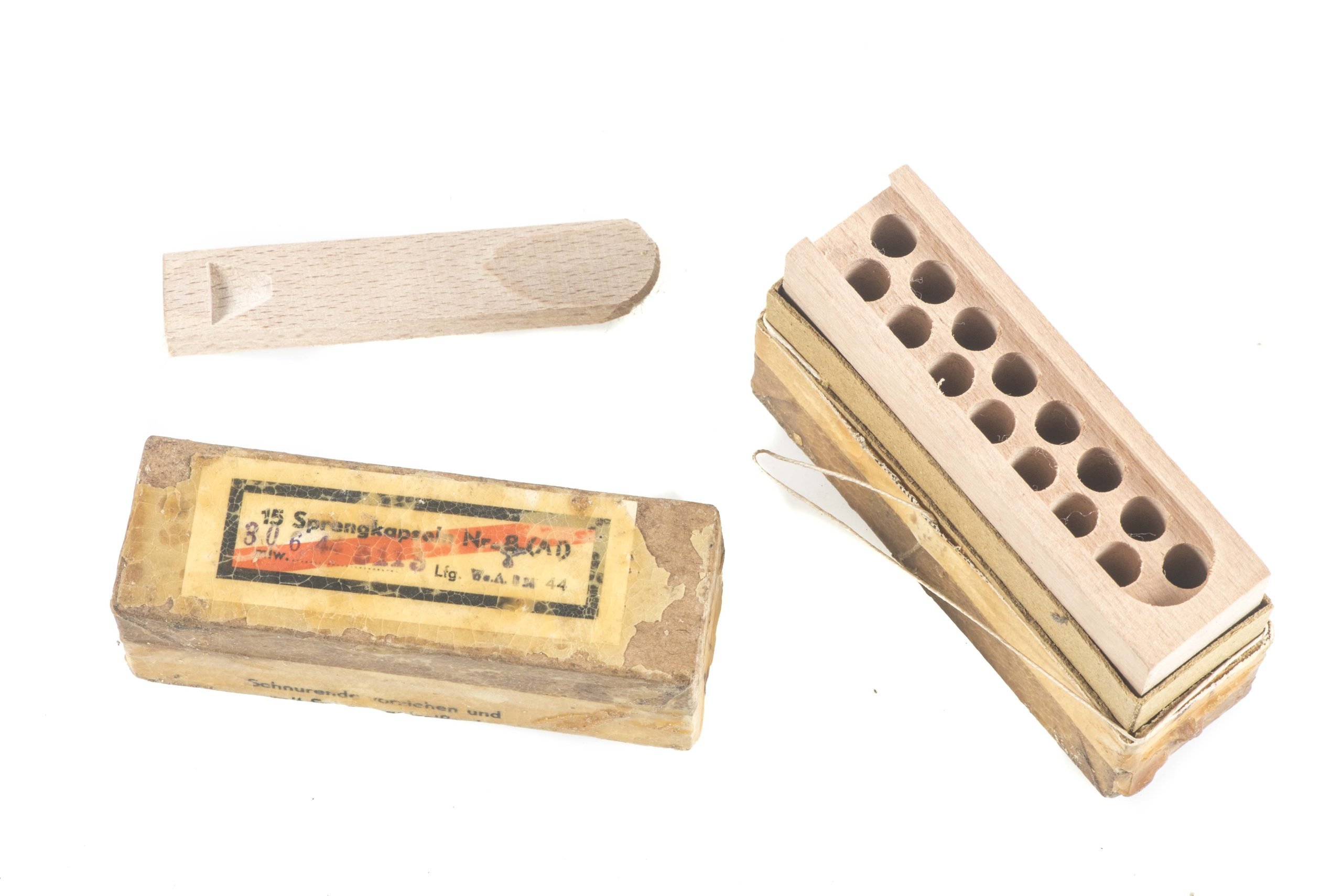 Rare wooden box complete with its cardboard packaging for the transport of 15 Sprengkapseln Nr. 8 (AI). Very hard to find complete with the cardboard packaging as well! The box is of course empty and without any content but in unissud condition!