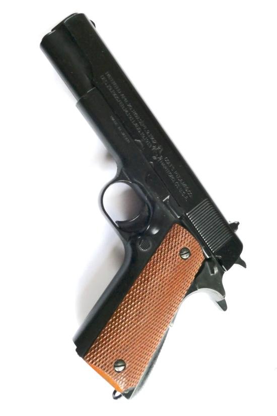 A vintage spring powered airsoft 6mm BB pistol from ASGK, made in Japan. The pistol is a faithful replica of the Colt 1911A1 pistol and bears the WW2 type engraving and 'US Property' details on the frame and slide. Made of plastic, the pistol is a full size model that has metal weights added to the grips. Although the slide functions to load and cock the pistol, which appears to work, the magazine is lacking. Sold for use as a theatrical prop or reenactment purposes. VCR Act applies.