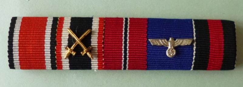 Really nice five-ribbon bar consisting of : 1939 Iron Cross 2nd Class / War Merit Cross 2nd Class with Swords / Ostfront Medal / Wehrmacht 4-year Service Medal / Sudetenland Medal.. The bar is backed with a fine field-grey cloth with working pin & hook. Excellent condition.