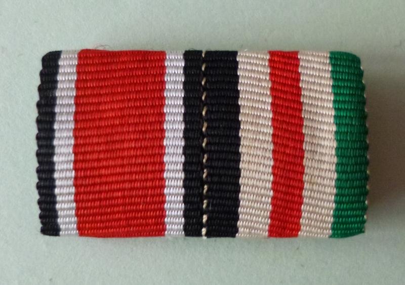 Two-ribbon bar consisting of : 1939 Iron Cross 2nd Class / Afrika Campaign Medal. The bar is backed with police green cloth and is complete with working pin & hook. Excellent condition....