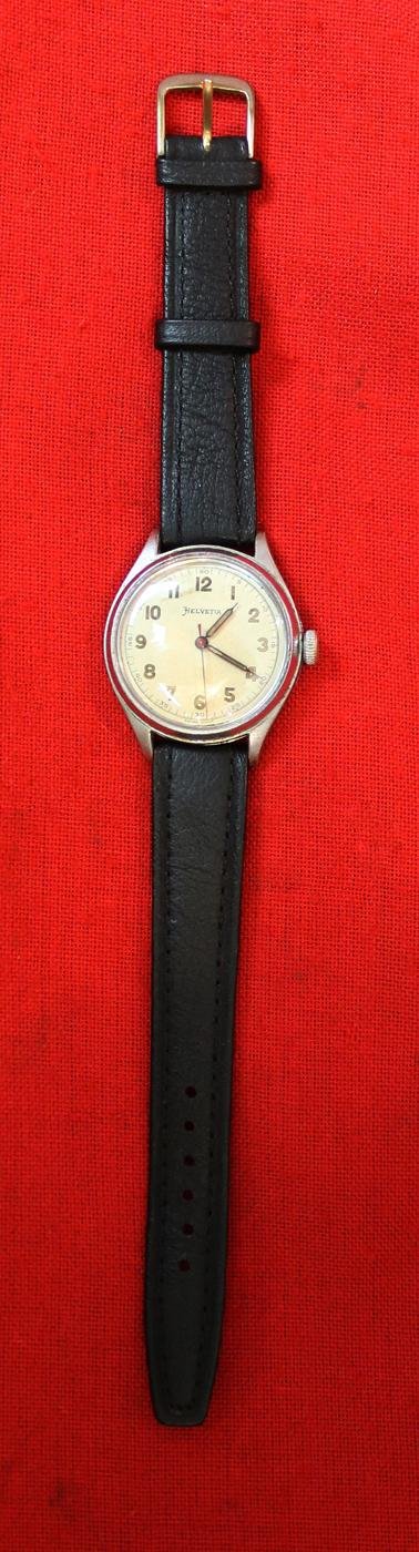 Supposedly only 8000 ever made. An Helvetia watch Co. fine & rare, original, German, Third Reich issue, 1940's military surveillance officer's wrist watch. Only the second we have found in over 30 years. Our last one was a type 2 case.A Helvetia DI H, Type 1 case {stamped 3199 with 2 below} watch, second type dial signed Helvetia and Swiss made, 800C movement, Deutsches Heer officer issue, but classified as the rare type. Serial numbered DI 0000688 H, the '2' denotes an 11.5 ligne movementAll Type 1 case watches use the Helvetia 800C sweep second hand movement.This watch was issued by the German military during the early 1940's of World War II, Helvetia were a renowned Swiss maker producing fine and accurate watches for the Nazi officers.The case of the watch is nickel plated with light to average wear. The cream dial is in good condition with Arabic numerals, signed Helvetia Swiss Made. GWO/CThe movement is a hand wound Swiss movement. The watch sits on a black leather military style strap.The great majority of the companies were Swiss .with Helvetia being one of the best, making superb timepieces. Stamped either side of the probably three figure serial number, is the official Wehrmacht classification DI.H, with 2 and then 3199 stamped above. However DH was the regular stamp classification, but the much rarer type, have DI H with its serial number stamped between the I and H. This has always been the subject of debate amongst some collectors, due to some limited belief that they were assembled from parts, likely due to their rarity, however, this timepiece, alongside all the 'deemed correct' examples have the has the important 3199 stamp on the back case cover. In a seminal work 'A Concise Guide to Military Timepieces 1880 -1990' by Z.M. Wesolowski IT specifies that the DI H marks are 'Deutsches Heer property marks found on non-waterproof wristwatches used for surveillance purposes, the I in DIH may stand for Inteligenz or Italienisch for surveillance officers and spies etc.The Italienisch mark may have been for a contract for the specialist Italians serving with the Afrika Korps in the desert campaign under Rommel.See in the gallery three photographs of the standard watch type, with regular black dials, worn by officers during World War II in the German Heer/SS, one being Herbert Otto Gille, seen here as SS-Gruppenführer and commander of 5. SS Panzer Division Wiking.Helvetia DI H watches are really relatively rare, it seems that only around 8000 of all types were ever completed