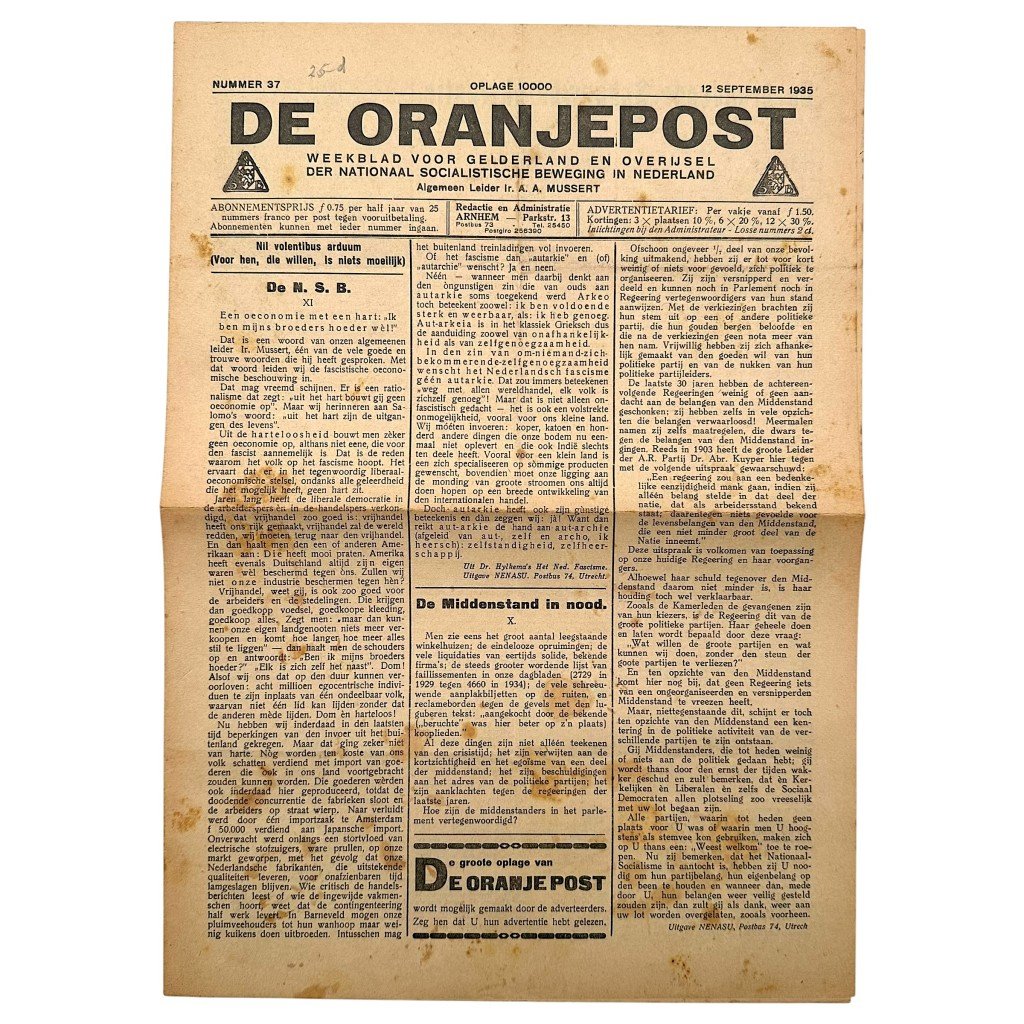 Original example of De Oranjepost, number 37, dated 12 September 1935, with a print run of 10,000 copies.This weekly newspaper for Gelderland and Overijssel was a regional publication of the National Socialist Movement (NSB) in the Netherlands under the leadership of Ir. A.A. Mussert. The editorial office and administration were based in Arnhem (Parkstraat 13).The front page includes, among other items, the article 'De N.S.B.', with references to Mussert and fascist economic ideology, as well as the piece 'De Middenstand in nood' (The Middle Class in Distress). Attention is also given to contemporary issues such as 'De brandende Schouwburgkwestie' (The Burning Theatre Affair) and various political commentaries. The newspaper refers to publications by Dr. Hylkema and editions issued by NENASU (Utrecht, P.O. Box 74).Inside, extensive sections such as 'Kringnieuws' (District News) and 'Spreekuren' (Office Hours) list numerous regional branches, including Kring Arnhem, Apeldoorn, Deventer, Twente-Zuid, Winterswijk, IJsseldelta, and Zutphen. Locations mentioned in this edition include Arnhem, Velp (G.), Apeldoorn, Deventer, Winterswijk, Zwolle, Zutphen, Nijmegen, Doesburg, Lochem, Enschede, Dieren, Doetinchem, and Barneveld.Various names appear throughout the issue, including Dr. Emile Verviers, S.L.A. Raak, J.D. Zandvoort, and other district and group officials. The newspaper also contains numerous advertisements from regional businesses such as H. Redeker (Lochem), J.M. Bosveld (Arnhem), G.J.C. de Bekker (Arnhem), Boekdrukkerij H. Gerns (Doesburg), P. Gansenkolk (Velp), and A.M. Smit & Sons (Arnhem).In addition, advertisements promote various NSB-related publications and materials, including propaganda items, insignia, and the brochure 'De Geheime Geldbronnen der N.S.B.' (The Secret Financial Sources of the NSB).This original newspaper issue provides a clear snapshot of the organizational structure, propaganda activities, and regional spread of the NSB in the mid-1930s. A historical document and interesting collector's item for enthusiasts of pre-war Dutch political history, NSB-related publications, and interwar memorabilia.Article number: 18153Originele 1935 Nederlands NSB lokale krant 'De Oranjepost' Gelderland en Overijssel