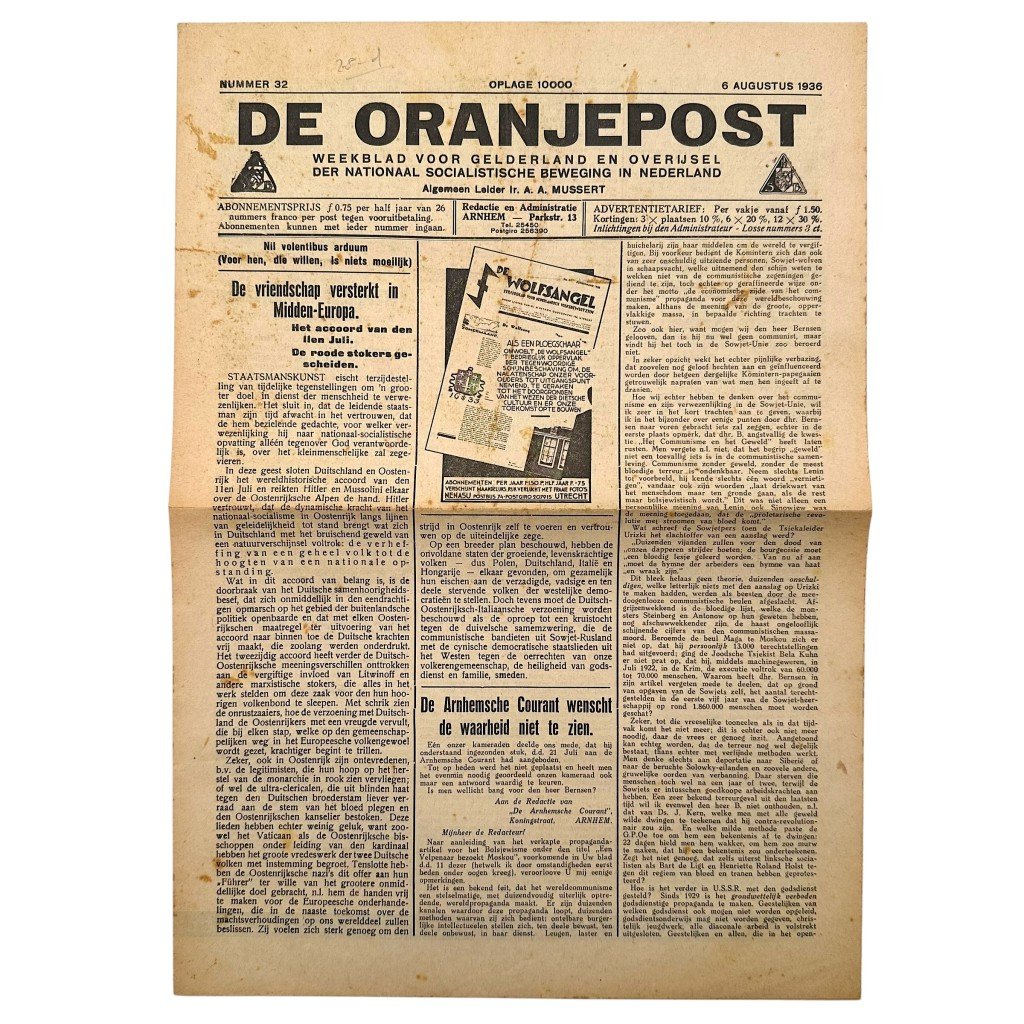 Original example of 'De Oranjepost,' issue number 32, dated 6 August 1936, with a print run of 10,000 copies. This rare weekly newspaper for Gelderland and Overijssel was a regional publication of the National Socialist Movement in the Netherlands (NSB), led by Ir. A.A. Mussert. The paper was edited and administered from Arnhem (Parkstraat 13).The front page features, among other items, the article 'De vriendschap versterkt in Midden-Europa' ('Friendship Strengthened in Central Europe') and references to international developments in Germany, Austria, and Italy. Various Dutch locations are mentioned throughout the issue, including Arnhem, Rheden, Winterswijk, Zutphen, Rijssen, Amsterdam, Nijmegen, Velp, Heteren, Dieren, and 's-Heerenberg. Foreign references include Poland, Germany, Hungary, Italy, and the Soviet Union.This issue also contains sections such as 'Kringnieuws' (with departments in Arnhem and Zutphen), advertisements from local entrepreneurs including J.M. Bosveld (Arnhem), G.J. van Leeuwen Jr. (Heteren), and H.J. Caro (Velp), as well as propagandistic announcements of NSB publications such as 'Het Nederlandsche Fascisme' by Dr. C.B. Hylkema, and works by Dr. W.Th. Boissevain, Dr. H.W. van der Vaart Smit, and Jhr. Groeninx van Zoelen.This original newspaper issue provides a compelling snapshot of the political and social climate in the Netherlands during the 1930s and serves as a historical document within the context of pre-war Dutch politics. An interesting and scarce collector's item for those interested in NSB material and Second World War–related history.Article number: 18145Originele 1936 Nederlandse NSB krant 'Oranjepost' Gelderland and Overijssel