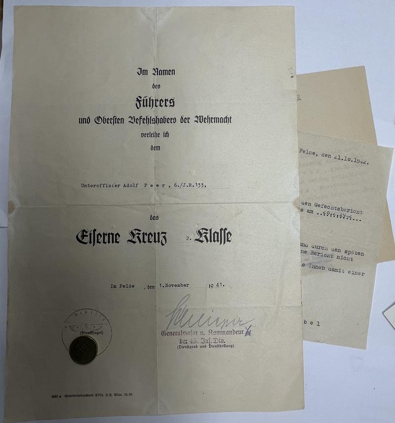 Great A4 size EK II citation of 'Unteroffizier' Adolf Peer who served within Inf.Rgt.133 of the 45.Inf.Div.The citation has been signed by 'Generalmajor' and divisional commander Fritz Schlieper (RK 27-12-1941)Peer was KIA 20-2-1942 in Russia as was stated by the 2 added documents.