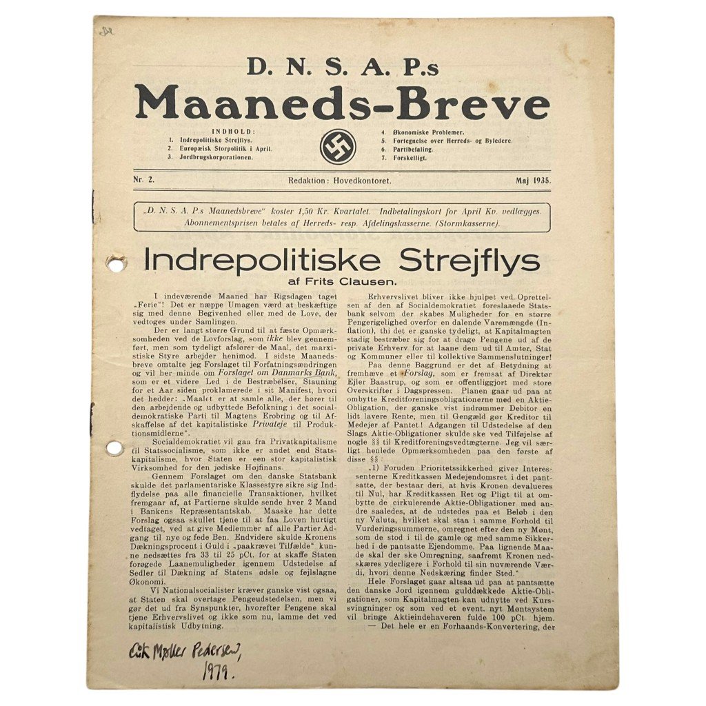 Original example of 'D.N.S.A.P.s Maaneds-Breve', no. 2, dated May 1935, issued by the headquarters of the Danmarks Nationalsocialistiske Arbejderparti (DNSAP). This Danish National Socialist monthly publication was edited by the party's central office and prominently features the party designation and swastika emblem on the front page.The opening article, 'Indrepolitiske Strejflys,' is written by party leader Frits Clausen and addresses domestic political and economic issues.This issue also includes articles such as 'Europæisk Stoppolitik i April,' 'Den kommunistiske Verdenskonference,' 'Sovjet-England forberedes i Moskva,' 'Fransk Hykleri,' and 'Frimureriet opløses i Portugal,' as well as contributions on national economic themes and agricultural policy, including 'Meddelelser fra Jordbrugskorporationen' and discussions of financial and social matters.Numerous international and national locations are mentioned throughout the text, including Moscow, Skodsborg, London, Paris, Geneva, Portugal, Fredericia, Aarhus, Randers, Næstved, Slagelse, Aalborg, Copenhagen, Nykøbing Falster, Toftlund, and Danish regions such as Zealand (Sjælland), Jutland (Jylland), Funen (Fyn), Bornholm, and Southern Jutland (Sønderjylland).References are also made to Germany and study trips to Tyskland.In addition to Frits Clausen, various names appear in organizational notices and party communications, including C.O. Jørgensen, Anders Malling, Arildskov, Helge Schou, Folmer Christensen, Bruno Jepsen, Hans Christensen, Otto Bensen, J.E. Stahr, and M.K. Madsen, among others associated with party structures, departments, and regional leadership.The publication further contains sections on party organization, appointments, expulsions, propaganda activities, voluntary labor service, and party funding. At the rear, an extensive list of herreds- and byledere (district and city leaders) is included, with place names from across Denmark.This issue provides a clear insight into the ideological direction, organizational structure, and international outlook of the DNSAP in the mid-1930s. A characteristic and historically significant document from the Danish National Socialist movement during the interwar period, of interest to collectors of Scandinavian political history, interwar printed material, and Second World War–related documentation.Article number: 18160