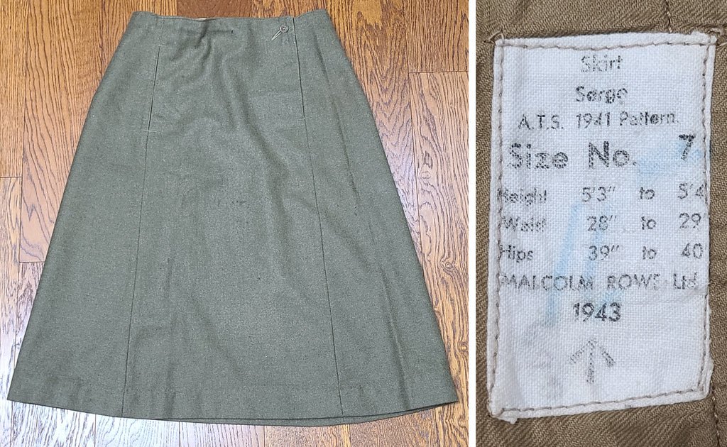 Original WWII British A.T.S. (Auxiliary Territorial Service) skirt. Dated 1943.MEASUREMENTS (approximate):Waist- 26'Hips- 36'Length- 25 3/4'The label inside gives slightly larger measurements than what my tape measure does. I don't know if it shrunk a little over time or if it got the wrong label. Pocket on one side, button and snap closure on the other side. In decent condition, but there are a few small holes and some areas of wear.