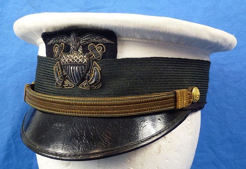 The white cotton top of the visor cap exhibits mild age toning and a few subtle spots, but it is generally quite clean and without holes or damage. The front of the cap displays a toed silver bullion U.S. Navy officer eagle. Th gold chin strap is similarly toned. The surface of the visor shows some relatively minor age crazing. The full leather sweatband is present and intact on the interior. The cap, being designed for summer wear, is unlined. Overall the cap is in excellent condition and it makes a very fine appearance.