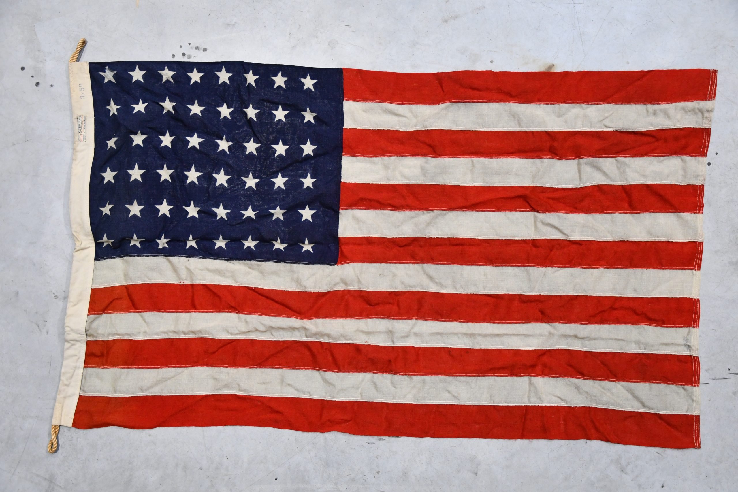 A fine WW1 period American national flag, featuring 48 stars, the official pattern used between 1912 and 1959.This example has a tape edge with rope ties and retains its original manufacturer's label.The flag measures approximately 3 x 5 feet.There are a few small holes, consistent with age and use, but overall it remains in generally good condition.A desirable and evocative patriotic display piece from the WW1 era, representative of theUnited States of Americaduring the First World War.