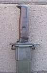 Original period manufacture. Standard 16 inch blade with a WWII parkerized finish. One side of the ricasso is maker marked SA Bursting Bomb & 1918 date, the other side US and the serial number 1019765. The blade is clean, no corrosion issues, just typical age and wear. Mix of patina and parkerized finish on the guard and pommel, lock button works as it should. Original wood grips, displaying scattered wear and use, no cracks. OD plastic body scabbard, with a steel throat marked USN Mk1. Clean bayonet overall.