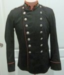 Original period manufacture. Dark blue wool double breasted coat, with pink wool piping on the cuffs, top of the collar and down the front. Thin silver wire shoulder straps, silver buttons decorated with the Imperial eagle. On each side of the collar are three rank pips and a nicely made metal winged wheel emblem. Loop for a single award on the left chest. Black polished cotton body lining, with striped sleeve lining. The right sleeve has a United Costumers property inkstamp. All buttons are present, no moth issues to note, size is about a 36-38.