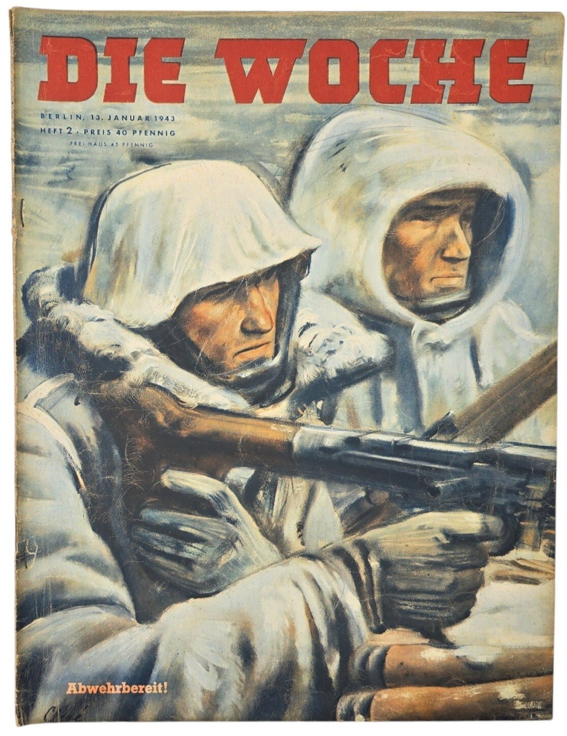 Original WW2 German Magazine - Die Woche No. 2, MG-SchĂŒtze (1943)Die Woche is a German magazine published between 1899 and 1944. The magazine illustrated the news around the world. From the rise of the NSDAP, Die Woche was Nazified and was filled with national socialist articles and images. The magazine ended in 1944 because of paper shortages.Pencil stripes on and inside the magazine.Origineel Wo2 Duits Tijdschrift - Die Woche Heft 2, MG-SchĂŒtze (1943)Die Woche was een Duits tijdschrift dat tussen 1899 en 1944 verscheen. Het tijdschrift illustreerde het nieuws van over de hele wereld. Vanaf de opkomst van de NSDAP werd Die Woche nazificeerd en gevuld met nationaalsocialistische artikelen en afbeeldingen. Het tijdschrift werd in 1944 opgeheven vanwege papierschaarste.Potloodaantekeningen binnen en aan de kaft.