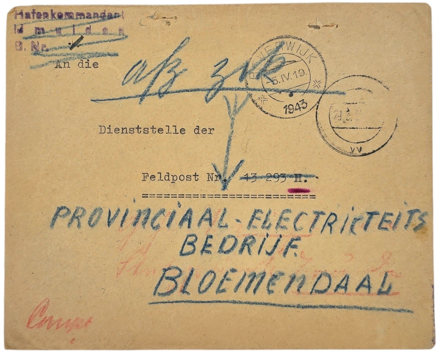 Original WW2 German Document - Envelope Hafenkommandant IJmuiden, Beverwijk, Bloemendaal (1943)