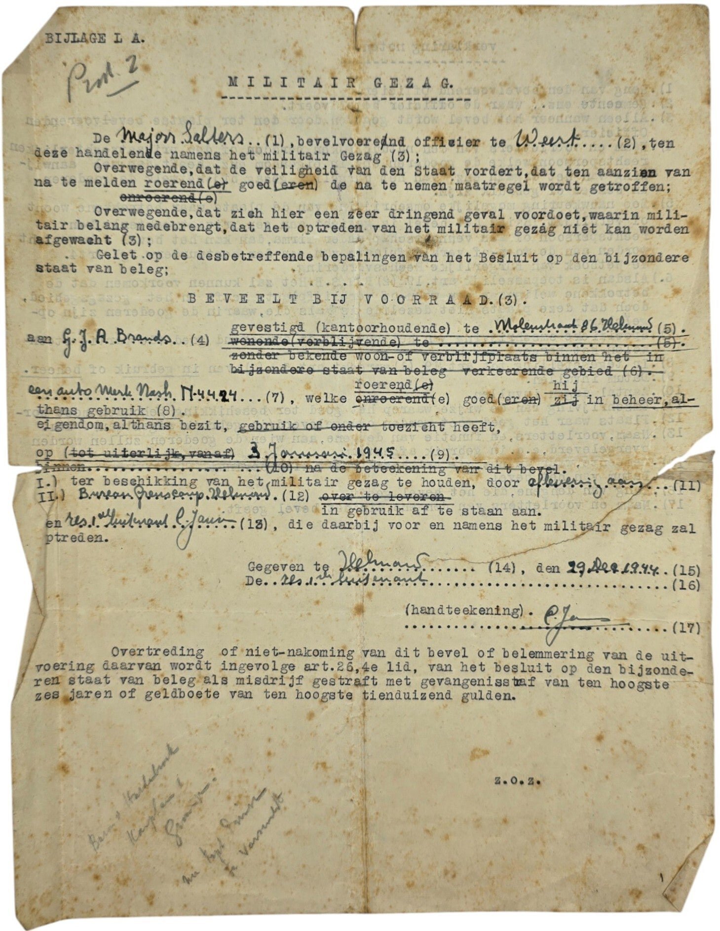 Original WW2 Dutch Allied Document - MG Militair Gezag Weert, Helmond (1944)The document has a tear.Origineel Wo2 Nederlands geallieerd Document - MG Militair Gezag Weert, Helmond (1944)Het document heeft een scheur.