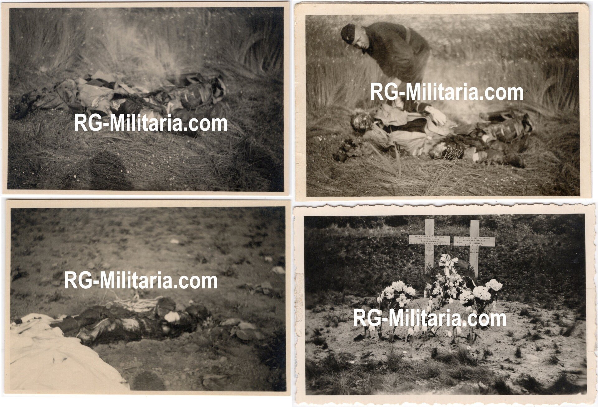 Original WW2 German Photo - KIA German pilot,2./KGzbV 1,Wassenaar, Holland, May (1940)Approximately 6 x 9 cmA series of four pictures of the Luftwaffe pilot, Heinz Hugo Schmidt. (2./KGzbV 1) On the 10th of May, he flew from Werl Airfield to Moerdijk in his Junkers Ju52. During the flight, his airplane was shot down by a Fokker TV. His airplane crashed above Wassenaar. His body was recovered by German Luftwaffe troops, and he was buried in a field grave in Wassenaar. In 1942, he was reburied in The Hague. Now he is buried in Ysselsteyn.He was buried next to Leo Rimkus (Infanterie Regiment 47) who also died on the 10th of May 1940.Ex libris stamps on the backside.Only for museums and/or serious collectors/researchers.Originele Wo2 Duitse Foto - Gesneuvelde Duitse piloot,2./KGzbV 1,Wassenaar, Nederland, Mei (1940)Ongeveer 6 x 8 cmEen serie van vier foto's van de Luftwaffe-piloot Heinz Hugo Schmidt. (2./KGzbV 1) Op 10 mei vloog hij in zijn Junkers Ju52 van vliegveld Werl naar Moerdijk. Tijdens de vlucht werd zijn vliegtuig neergeschoten door een Fokker TV. Zijn toestel stortte neer boven Wassenaar. Zijn lichaam werd geborgen door Duitse Luftwaffe-troepen en hij werd begraven in een veldgraf in Wassenaar. In 1942 werd hij herbegraven in Den Haag. Nu ligt hij begraven in Ysselsteyn.Hij werd begraven naast Leo Rimkus (Infanterieregiment 47), die eveneens op 10 mei 1940 overleed.Ex libris stempels achterop.Alleen voor musea en/of serieuze verzamelaars/onderzoekers.