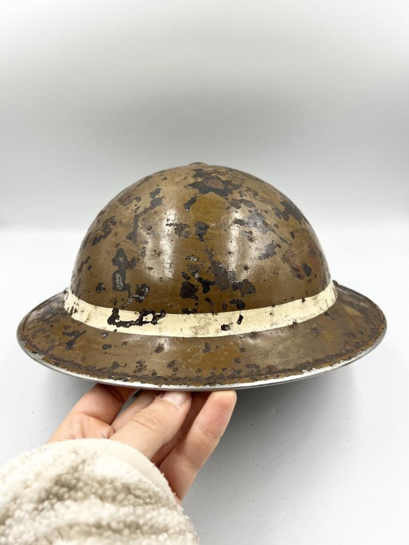 1939 dated shell, 1939 dated liner size 7, original brown semi gloss paint to exterior with painted white band around the edge. Chin strap is named W. McN. Condition is good but showing lots of wear and use. Paint to exterior is chipped and cracked in many places.More images are available upon request.