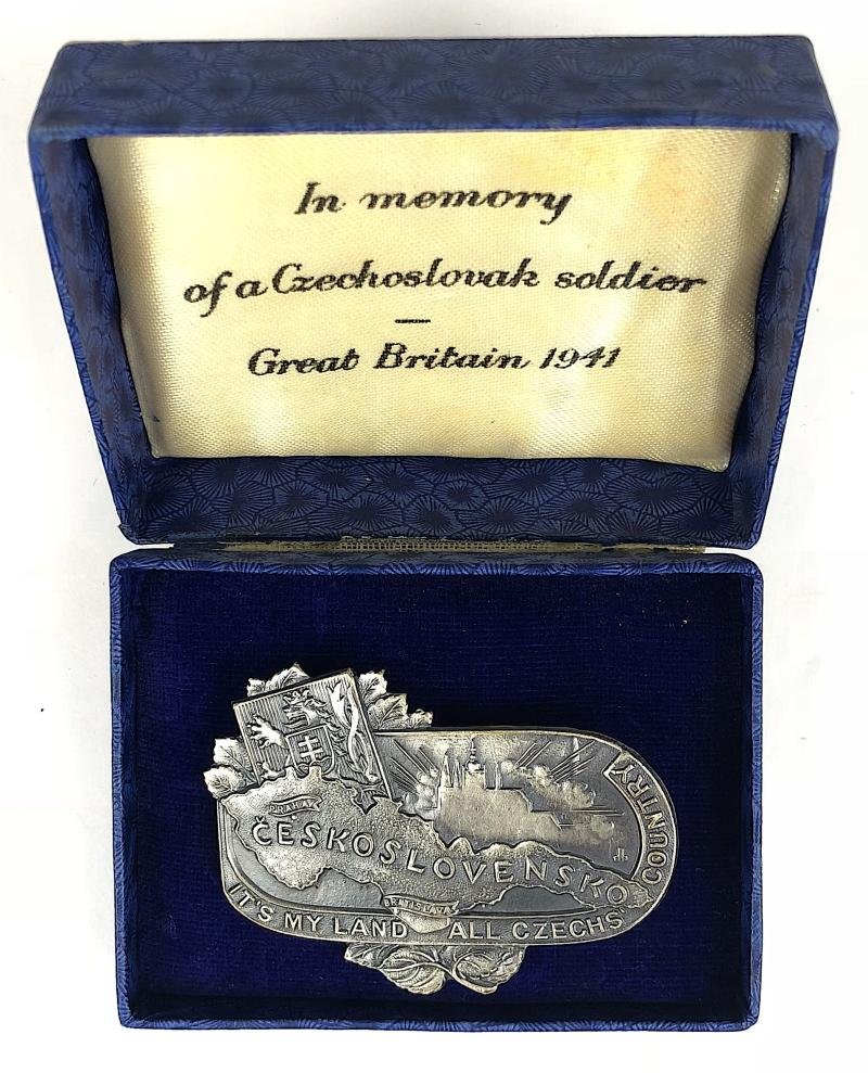 A scarce ORIGINAL Second World War period English made example in the form of a large die-cast oxidised sliver plated embossed map of Czechoslovakia superimposed over Prague Castle and shield bearing the Czechoslovak lion and carrying the French 'Cross of Lorraine', the base enclosed by a curved border scroll stating 'ITS MY LAND ALL CZECHS COUNTRY'; the reverse with embossed maker's details 'H.W.Miller Ltd B'Ham 18' Very good condition, complete with original pin fittings and original presentation case, base maker's deiails present but detached Size approx 53 x 39mm. Free Czechs were heavily involved in the Normandy Landings.
