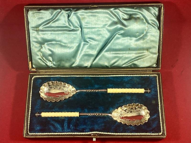 Here on offer is a beautiful pair of antique silver plated Berry Spoons, with their original fitted case, circa 1880.The solid spoons have scalloped edged bowls engraved inside with a berry/vine leaf pattern.The silver plated handles have a twisted metal section and a beautifully carved bone section, that look like tiny vertebra. The tip is finished with an ornate pommel.There are no makers marks that I can see on the spoons or case.The set comes in its original black leatherette hard case which has a fitted green velvet and silk lining.The spoons are in mint condition, with no loss of plating and look to have never been used. There are just a few marks to the base of the box, through storage over the years.Each spoon measures 6.25' (16cm) long with a bowl width of 1.3' (3.3cm).With the case they weigh 208g.Please see my pictures for the details of the condition, which complement this description.Please see my TERMS OF BUSINESS regarding Deliver Charges and Insurance regarding additional insurance cover, should you require it, BEFORE the item is dispatched.The responsibility lies with the customer to check with your Customs restrictions that this item can be imported into your country.
