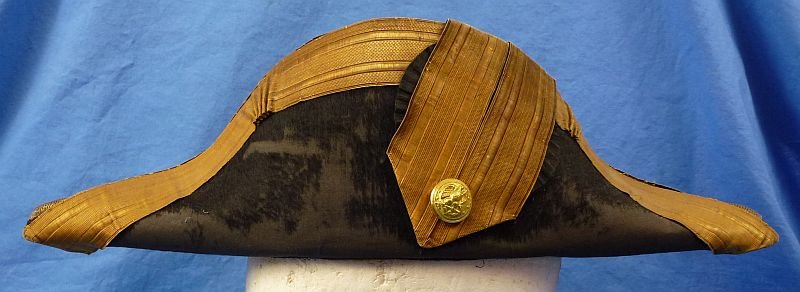 The hat shows significant wear to the exterior velvet surfaces. The gold bullion tape and knots are toned with age. The interior of the hat is maker marked by the N.S. Meyer firm and it bears the written name of 'Sexton'. This was presumably Walter R. Sexton who, after graduation from the Naval Academy, served in the Spanish–American War and the Philippine–American War. He commanded the destroyerBainbridgefrom August 1904 to March 1905. In 1906, Sexton was given command of the cruiserVesuvius. In July 1909, he was promoted to lieutenant commander.In 1913, he served as flag secretary on the staff of Rear Admiral Charles J. Badger aboard the battleshipWyoming. In August 1916, he was promoted to commander. During World War I, Sexton received a temporary promotion to captain and served on the staff of the commander-in-chief of U.S. naval forces in European waters, earning the Navy Cross.After the war in October 1919, Sexton replaced Rear Admiral Harry S. Knapp as the U.S. naval attaché in London. He was then given command of the armored cruiserFrederickfrom November 1920 to February 1922. In June 1921, his promotion to captain was made permanent. Sexton served as the commanding officer of the battleshipUtahfrom April to October 1925.Sexton was given command of Destroyers, Scouting Fleet in 1929 and promoted to rear admiral in March 1930. In 1931, he became an Assistant Chief of Naval Operations. In 1933, Sexton was named commander of Battleships, Battle Force and given the temporary rank of vice admiral. From 1934 to 1937, he reverted to his permanent rank of rear admiral and served on the Navy General Board. From 1937 to 1939, Sexton was commander of Destroyers, Battle Force.From 1939 to 1942, Sexton served as chairman of the Navy General Board. He retired after reaching the age of sixty-four in September 1940, he was then originally slated to be replaced by Rear Admiral John W. Greenslade but was then personally asked to stay on by President Franklin D. Roosevelt.Unlike many senior naval officers with whom he served, Sexton was not advanced to vice admiral on the retired list because he had not served a full calendar year at that rank. In August 1942, he was replaced as chairman by Rear Admiral Arthur J. Hepburn but continued to serve as a member of the General Board.