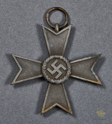 German WWII War Merit Cross 2ndClass w/o Swords-This war merit cross has lost the majority of its original finish. The remaining zinc has toned to a gray color. A sound example.History: The War Merit Cross was instituted in October 1939, in two classes with both classes issued, with and without swords. These were awarded to military personnel and civilians, including females and foreigners, for exemplary service and/or bravery in Germany's war effort, in a non-combatant role. The addition of swords to the award signified bravery while awards without swords were bestowed for service.