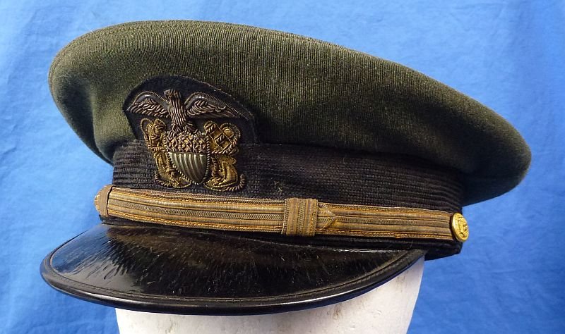 The ribbed green wool body of the cap shows a few small holes or fabric pulls. The front of the cap displays a toned Navy officer insignia in gold and silver bullion. The surface of the patent leather visor exhibits age crazing. The interior leather sweatband is present, with a bit of lost stitching in the rear. The interior retains the card of 'Kenneth G. Schlegel'as an Ensign in the U.S. Naval Reserve. The body of the cap is a bit flattened from storage. Overall good condition.