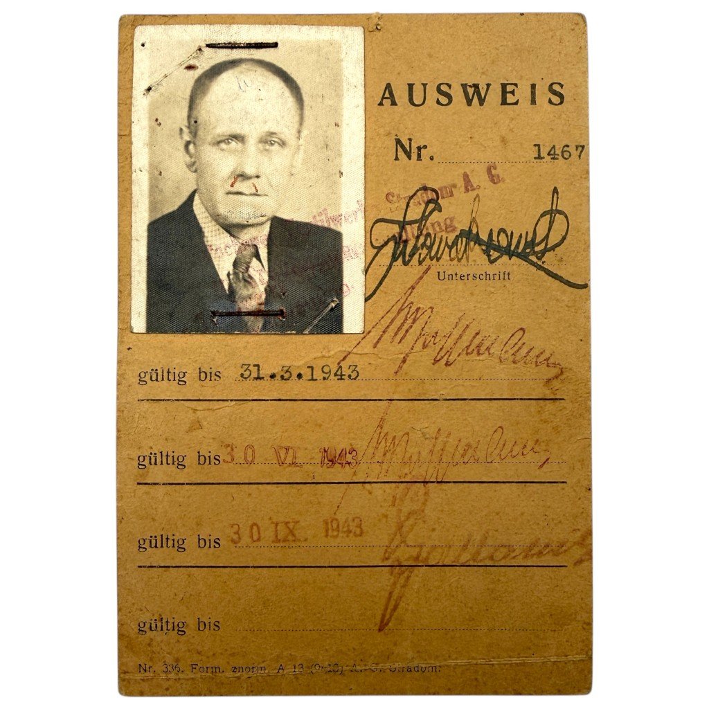 This original Ausweis is a German labor and company identification pass from 1943, issued by Tschensstochauer Textilwerke 'STRADOM' A.G. in Treuhandverwaltung, located at Marienburgerstr. 21 in Tschensstochau (present-day Częstochowa, Poland).The pass is issued in the name of Jakub Nowakowski (born 8 July 1887), residing at Breslauerstr. 27 in Tschensstochau, and states that he was employed at the factory within occupational group 11b. The document is numbered (No. 1467) and includes a photograph, stamps, signature, and several validity extensions through 30 September 1943. The Ausweis is in used condition, consistent with wartime use.During the Second World War, the textile factory in Tschensstochau was under German administration (Treuhandverwaltung) and formed part of the industrial system confiscated and controlled by Nazi Germany in occupied Poland.Article number: 18189Originele WWII Duitse Ausweis Tschensstochauer Textilwerke 'STRADOM' A.G. in PolenDeze originele Ausweis betreft een Duitse arbeids- en bedrijfslegitimatiepas uit 1943, uitgegeven door Tschensstochauer Textilwerke 'STRADOM' A.G. in Treuhandverwaltung, gevestigd aan de Marienburgerstr. 21 te Tschensstochau (het huidige Częstochowa, Polen). De pas staat op naam van Jakub Nowakowski (geb. 8-7-1887), woonachtig aan de Breslauerstr. 27 te Tschensstochau, en vermeldt dat hij werkzaam was in de fabriek binnen beroepsgroep 11b.Het kaart is genummerd (Nr. 1467), voorzien van pasfoto, stempels, handtekening en meerdere geldigheidsverlengingen tot 30-09-1943. De Ausweis is in gebruikte conditie, passend bij gebruik in oorlogstijd. Tijdens de Tweede Wereldoorlog stond de textielfabriek in Tschensstochau onder Duits beheer (Treuhandverwaltung) en maakte deel uit van het door nazi-Duitsland geconfisqueerde en gecontroleerde industriële systeem in bezet Polen.