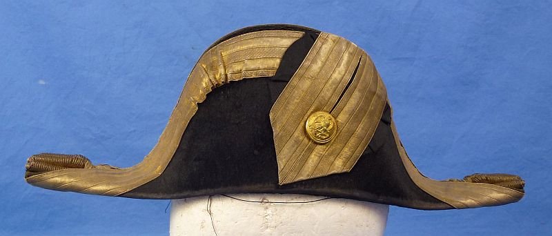 The fore and aft hat is in the 'Chapeau de Bras' style with a fur felt body bearing toned gold bullion trim. The interior of the hat is lined with red silk and it bears the embossed name of the London uniform clothier 'Joseph Starkey' in the crown. Th hat shows some fur loss in areas on the bottom edges. Overall very good condition.