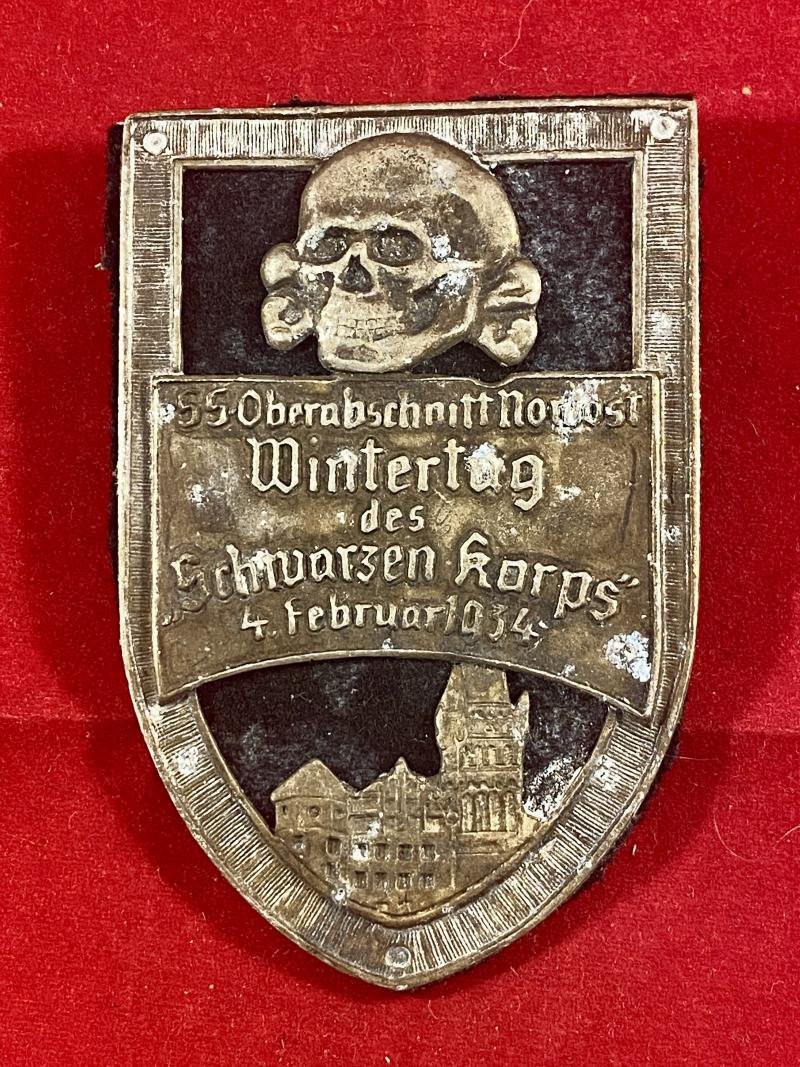 Here on offer is an example of a German WWII Waffen SS 1934 Wintertag Badge.To be honest I can't be sure if this an original or a reproduction piece. The reproductions are so good these days it is almost impossible to tell?Therefore, I am selling it as a REPRODUCTION piece as I can't guarantee its original…..Someone may get a bargain, or just an impressive copy.The badge is made of a two piece aluminium construction with a black wool in center.It depicts the SS Skull at top and Castle at the base Then there is raised lettering that reads as:SS Oberabschnitt NordostWintertagdes''Schwarzen Korps''4. Februar 1934On the back it is faintly stamped 'Ges Gesch and retains its fixing pin, that is now slightly rusty.The front of the badge shows signs of age oxidisation, which actually adds to its appeal.It measures 3.2' (8cm)long by 2.1' (5.4cm) wide and weighs 24g.Please see my pictures for the details of the condition, which complement this description.Please see my TERMS OF BUSINESS regarding Deliver Charges and Insurance regarding additional insurance cover, should you require it, BEFORE the item is dispatched.The responsibility lies with the customer to check with your Customs restrictions that this item can be imported into your country.