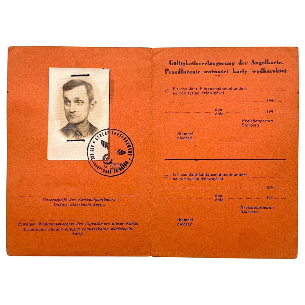 This original Angelkarte (fishing permit) from 1944 is a German occupation document from the Second World War, issued by the Kreishauptmannschaft Radom (District Authority of Radom) within the General Government.The card was issued on May 23, 1944 in Radom in the name of Bolesław Griedeck, residing in Kice near Radom, and officially granted him permission to fish within the designated district. The document features an original passport photograph, handwritten personal details and signature, as well as a clear official stamp of the German Kreishauptmann.The condition is used and authentic, with visible signs of age, light discoloration, rust marks from the photo attachment, and normal wear consistent with administrative use during wartime. During the Second World War (1939–1945), Radom was part of the General Government under German occupation and served as an important administrative center where civil permits and even leisure activities were strictly regulated by the occupation authorities.This Angelkarte is a historical collector's item and represents a tangible example of civilian control and permit structures in occupied Poland. Such local identification and permit documents from the Polish occupation period are increasingly difficult to find today.An interesting piece for a militaria or Second World War documentation collection.Article number: 18212Originele WWII Duitse Angelkarte (Karta wędkarska) uit Radom in PolenDeze originele Angelkarte (Karta wędkarska) uit 1944 betreft een Duits bezettingsdocument uit de Tweede Wereldoorlog, uitgegeven door de Kreishauptmannschaft Radom (Starostwo Radom) binnen het Generalgouvernement. De kaart werd afgegeven op 23 mei 1944 in Radom op naam van Bolesław Griedeck, woonachtig in Kice bij Radom, en verleende hem officieel toestemming om te vissen binnen het betreffende district.Het document is voorzien van een originele pasfoto, handgeschreven gegevens en handtekening, evenals een duidelijke officiële stempel van de Duitse Kreishauptmann.De conditie is gebruikt en authentiek, met zichtbare ouderdomssporen, lichte verkleuring, roestsporen van de fotobevestiging en normale slijtage passend bij administratief gebruik in oorlogstijd.Tijdens de Tweede Wereldoorlog (1939–1945) maakte Radom deel uit van het Generalgouvernement onder Duitse bezetting en fungeerde het als belangrijk administratief centrum waar ook civiele vergunningen en vrijetijdsactiviteiten streng gereguleerd werden door de bezettingsautoriteiten.Deze Angelkarte betreft een historisch verzamelobject en vormt een tastbaar bewijs van de civiele controle en vergunningenstructuur binnen bezet Polen. Dit soort lokale legitimatiekaarten uit de Poolse bezettingsperiode zijn tegenwoordig lastig te vinden.Interessant voor de militaria of Tweede Wereldoorlog documentatie collectie!