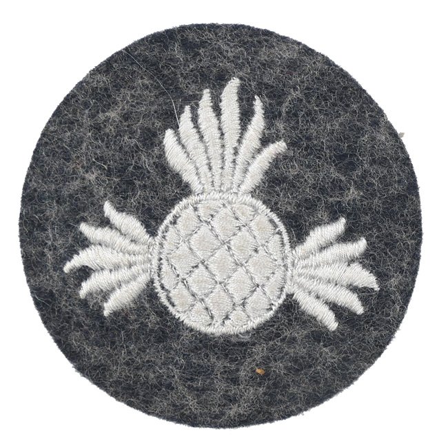 Luftwaffe heavy Aerial Bomb Armourer's (Waffenpersonal für schwere Bomben) Trade Badge (Tätigkeitsabzeichen). The armorer's trade badge was introduced on 8 November 1935 for wear by qualified personnel. The badge is executed in silver-white linnen, embroidered on a blue-grey woolen background. Nice example in good unissued condition!