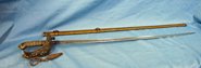 Original era manufacture. 32 inch polished steel blade with frosted panels on each side, 20mm width across the base of the blade. Age darkening and light pitting on each side of the ricasso, otherwise the blade is very, very nice. On the reverse of the ricasso the name NATHAN COVENTRY can be seen and on the right side a small brass disc with the word PROVED with a capital letter P flanked by two dots can be seen. According to one of our books this may be C.Webb & Company London, circa 1865. Gilded brass basket hilt and pommel, now showing a vintage brass patina. Fishskin wrapped grip with twisted wire binding. Attached to the guard is an original silver wire knot which has broken and then wired back together. Relatively dent free scabbard(amazing considering its brass)with two suspension rings. Nice vintage brass patina to the surface.