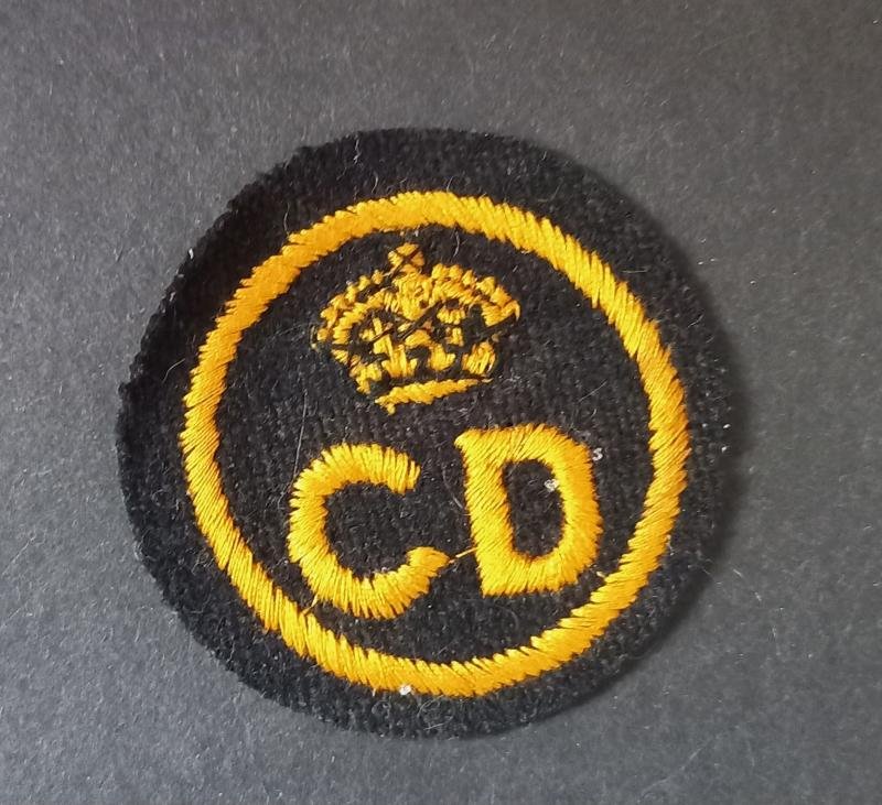 This is a good example of a British CD (Civil Defence) beret badge. This pattern of badge was introduced in 1943 to replace the metal ARP badge previously worn on the beret. Embroidered versions such as this were not actually official use but they did see widespread use.