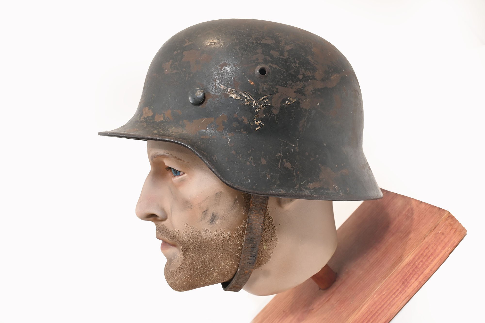 nice worn m35 ex double decal luftwaffe helmet.beautiful complete with original lba stamped chin strap.The Luftwaffe eagle is still clearly visible, but the tricolour was removed in the field in 1940, according to regulations.The helmet has a beautiful combat look and still has its original liner which also features the wearer's initials as well as in the neck of the helmet itself.stamped with ET64.