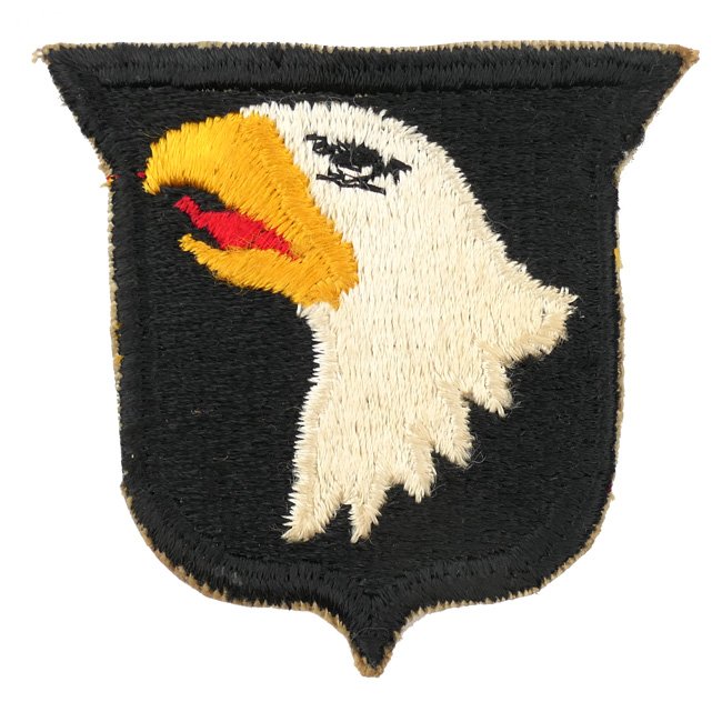 World War 2 U.S. 101st Airborne Division Patch. The division took part in D-Day, operation Market Garden and the Battle of the Bulge. The badge is nicely machine-embroidered, showing a correct wartime white back. The badge comes without the separate airborne tab. Nice original U.S. 101st Airborne Division patch in very good condition!