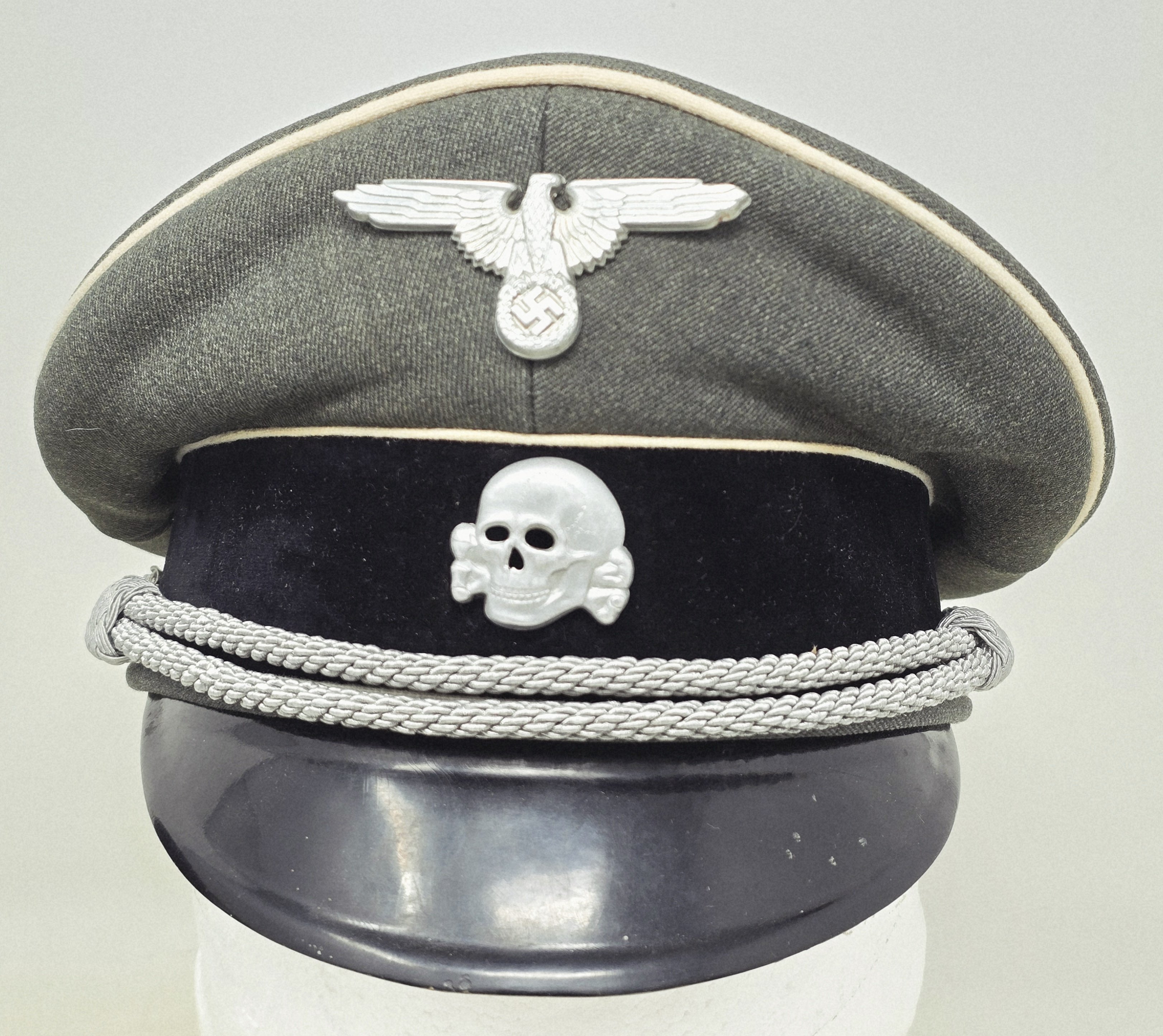This is a fine, mid-war quality gabbardine SS Officer's cap. It is piped in white, lined in cream-colored silk with celluloid sweat shield, leatherette sweatband with maker's mark on side. There are several sets of initials. The cap material is of the fine lindsamt velvet band. It is piped in white. The gabardine top is free of any damage or mothing is also piped in white. The seams and joins are in perfect alignment and as they should look. The lining plessier inside the cap band is folded in the correct direction and tacked all the way around. In the inside front, there is evidence of rebadging, but the insignia are correct and match nicely. Overall, a very nice piece, straight from a quality collection in Europe. COA accompanies.