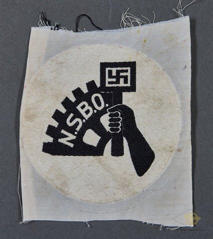 German WWII NSBO Athletic Shirt Insignia-The NSBO, 'Nationalsozialische Betriebszellen Organization' (National-socialist Industrial-cells Organization), acted as the NSDAP's alternative to labor unions and communist worker groups in industrial factories. Officially a national organization, the NSBO was concentrated in the heavy industrial centers. The NSBO was absorbed into the DAF in October of 1934, and ceased to exist in March of 1935. This insignia is black and white BeVo on a white disc. The insignia is in the form of a hand holding upright a hammer with a static swastika to its head. It has a partial cogged wheel proceeding to the left, the 'N.S.B.O.' is in white. There is some slight discoloration, but this is very rare and in very good condition.