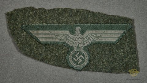 German WWII Army EM Breast Eagle-Handsome BeVo example cut directly from a green wool combat tunic. This is still attached to a large piece of tunic.