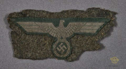 German WWII Army EM Breast Eagle-Handsome BeVo example cut directly from a green wool combat tunic. Excellent and desirable!
