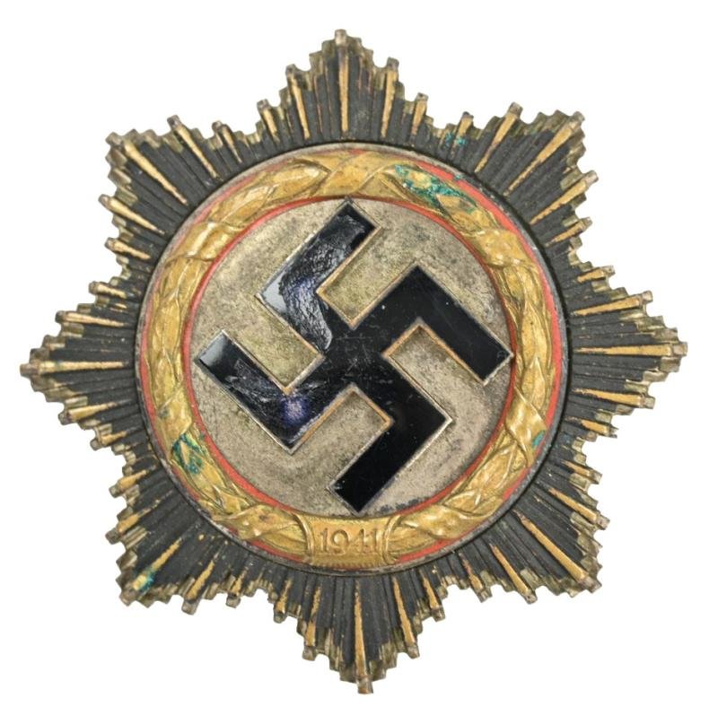 In a very stunning used condition a German Cross in Gold (DKiG, Deutsche Kreuz im Gold).The cross comes with clear traces of use and age and was resently found in a household in the unitd states of America and clearly a veteran bring back.The cross comes with a functional needle and catch on the reverse side and has the maker number 2 on the needle marked. Indiciting production by the C.E. Juncker Fabric from Berlin.The cross comes in the 5 rivets lightweight version.A very stunning clearly worn example with traces of damage, wear, age and with a great patina!hard to find Juncker version!