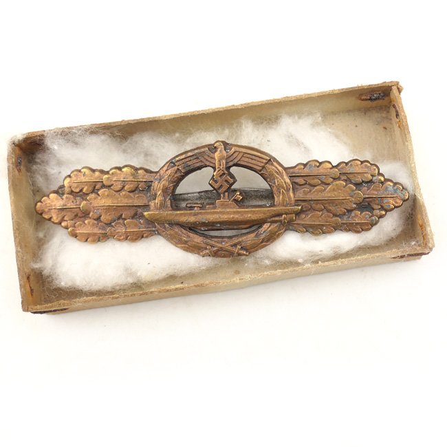 Kriegsmarine U-Boat Front Clasp in Bronze (U-Boot Frontspange). The U-Boat Front Clasp was instituted by Oberbefehlshaber der Kriegsmarine und Großadmiral: 'Karl Dönitz' on 15 May 1944. There were no specified merits for earning the award, decoration was based on the recommendations of the U-boat commander and subject to approval by Karl Dönitz. On 24 November 1944 a version in silver was introduced to further recognize bronze holders with continued merits and acts of valor. The clasp is executed in 'Feinzink' and still retains most of its original bronze finish showing only some minor zinc spots. The clasp is nicely marked with 'Entwurf Peekhaus' and 'Ausf. Schwerin, Berlin 68' indicating production by the company of 'Schwerin & Söhne' from Berlin. This is a second pattern clasp with the fluted pin. The clasp is complete with a functional pin & catch. The clasp comes in half its original carton box with original filling as found together. This clasp originates from a private household and was kept as a souvernir by a small boy at the end of the war in Narvik, Norway. Rare original U-Boat Front Clasp in good condition!
