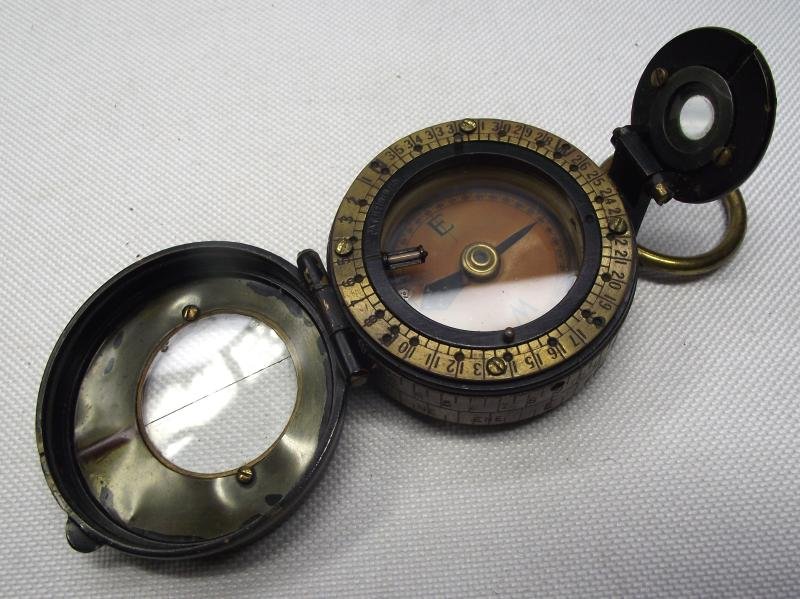 A very nice 1916 dated compass with its period leather pouch both named to a J.T.Scriven who was a member of the M.G.C. It would seem the compass was handed down, reused, on at least one occasion as there does appear to be at least two other names written to the lid of the case, at least one being another member of the M.G.C. I would rate the condition of both items as very good, case has seen plenty of use with tight stitching. The compass, dial swivels, case is without damage, complete with what appears to be some sort of illuminating rod on the glass above the dial, fist time ive seen this interesting addition. All in all a very nice named , dated and Regimentally marked!