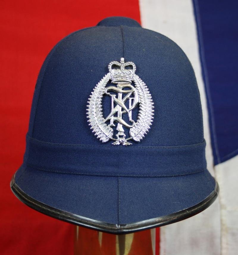 From a super collection of original and iconic British & Service Custodian Helmets from the 1980's on.Since the early 1950s, helmets have no longer been worn by police officers in Scotland, but may be seen worn by Metropolitan Police officers when on Royal duties in Scotland. They ceased to be worn in Northern Ireland after the 1920s, except for night patrol work in Belfast and Derry until the early 1960s.Police Helmet; a New Zealand Police constable's helmet, issued as part of their uniform. This style was used between 1986 and 1995. Identical to another example in the Mataura Museum. The iconic Custodian helmet was withdrawn from New Zealand Police service in 1995. Male Constable's/ Sergeant's 6 Panel blue serge helmet With Queen's Crown Helmet Plate and Chin Strap. It has an excellent exterior finish with correct 6 panel construction,vented top mount and headband.Manufactured by Mountcastle ltd