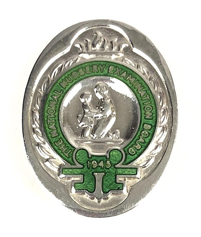 A scarce original 1960's period 'The National Nursery Examination Board nurses badge', the reverse impressed with Birmingham silver hallmarks for 1966 and maker's details 'T.F' (Thomas Fattorini). Very good condition, complete with original pin fittings, safety roller catch in good working order, no enamel loss.Height approx 28mm.'The National Nursery Examination Board' was founded in 1945 and merged in 1994 along with the 'Council for Early Years Awards' to become 'The Council for Awards in Children's Care and Education'.