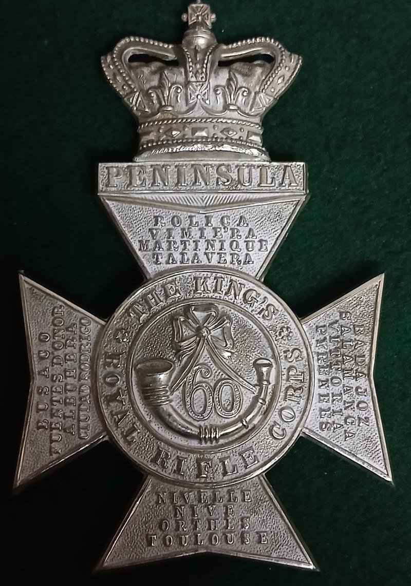 .Scarce officers Victorian silver plated helmet plate with broad tapering slider fitting to the reverse designed to be worn on the white foreign service helmet.The number ' 60 ' and a bugle horn to the centre of a circlet bearing the title on a Maltese cross with honours to each arm surmounted by the crown and a tablet carrying the main honour, ' Peninsula '