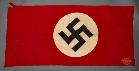 Veteran Bring Back German WWII NSDAP Party Banner-This party banner is made out of a rough bunting. It is a double sided printed example. The white disc is separately applied, with a black printed swastika. The white does show some age discoloration and slight staining, but overall, this flag is clean. The hoist end of the flag is frayed, where the veteran had torn this down from a city hall in the Netherlands. There are also marks at this end, where the flag was nailed or tacked up for a very long time. Please be sure to look at the photos to see what I mean. We were lucky enough to purchase this directly from the family of the soldier, we will supply the name, and a photo of the veteran to the buyer. This flag measures approx. 5 ft (152.4 cm) long by 2 ½ ft (76.2 cm) wide. A great piece of history!